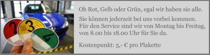 Wenn Sie vorab sichergehen wollen was für eine Plakette Sie bekommen. Prüfen Sie es schnell und einfach über unsere Dekrapartner. Plakettenprüfung: hier. |